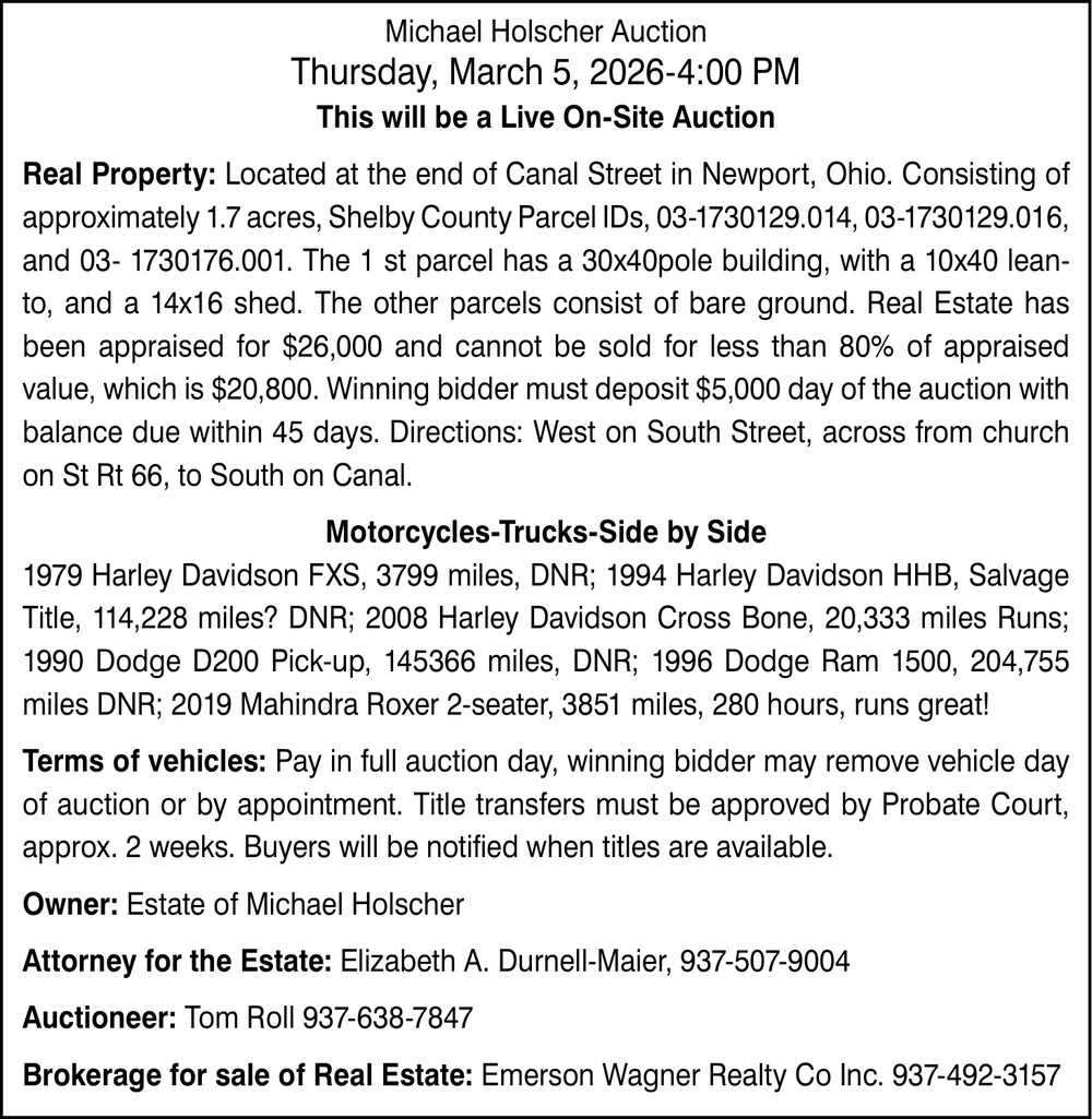 Feb 11, 2026. Michael Holscher Auction (March 5, 2026) Auctions Ads from Sidney Daily News